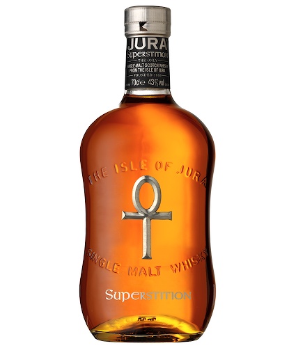Today, we sample Jura Superstition Single Malt Scotch. According to my research, the reason behind the title is not exactly clear, but who cares, what we want to know is what it tastes like, right? Jura Superstition is comprised of two malts, one heavily peated at 13 years old, the other at 21 years old, providing the mellowed complexity only a 21 year old malt can contribute. The resulting mix has a light but assertive peat influence with a richly sherried backbone. Hard to believe that the four humble pot stills of Jura can produce a whisky that finds its way to us, but we’re glad we found it. Your humble correspondents of the SWC offer their opinion…