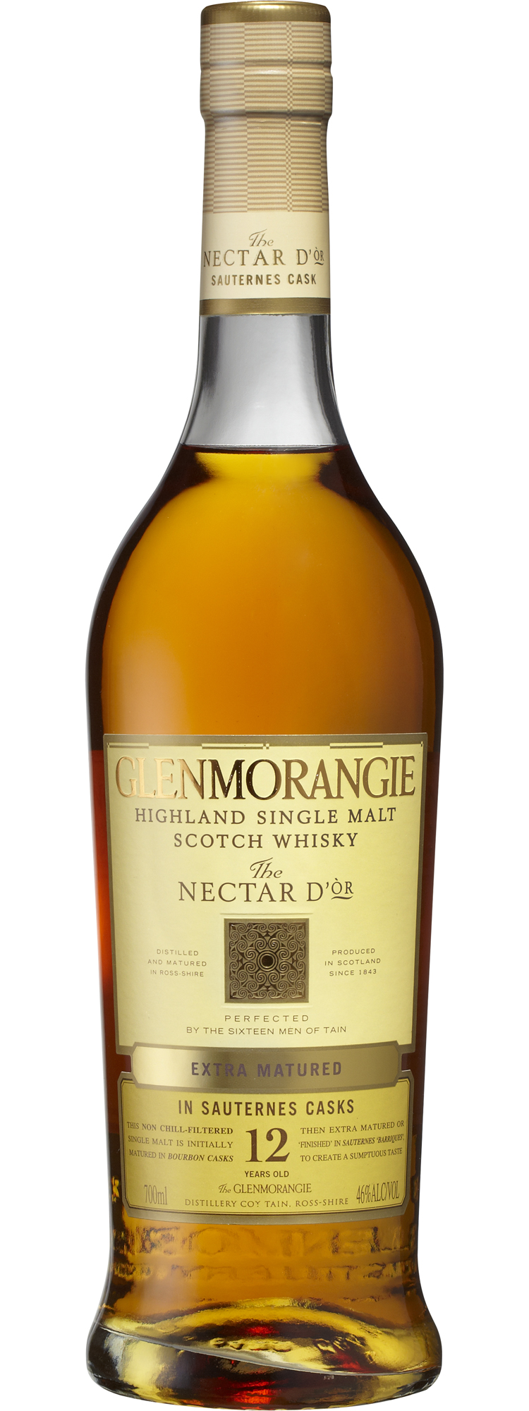 One of the unfortunate side effects of traversing through the whisky world for any good number of years is the inevitable boredom that ensues whether through plain snobbery or palate development over time. Your very first positive experience with a once trusted dram may have been nothing short of astonishing when you were a whisky rookie, but now that very same dram, sipped years later is now considered bottled death by the very same taste buds. Boiled down to a base understanding the reality is such: you now simply seek out new flavor experiences just to keep things interesting. We find ourselves so jaded, it must human to find complacency so easily. Yes, we like our sherry finished whiskies, but surely there is something else that can make our dreams come true, please? Let us go to France to find out. Glenmorangie Nectar D’or is one such example of the glorious newness we seek. Nectar D’or, like LaSanta before it and the soon to be reviewed Quinta Ruban, is Glenmorangie Original 10 year old single malt finished further in ex-Sauternes wine barriques from France. Sauternes wine is a very sweet white wine produced in the famed Bordeaux region from the fine Semillon grape. Like other dessert wine grapes, not all of the natural sugars are allowed to ferment in its production, thus leaving a number of residual sugars for more sweetness. The vines that produce the Semillon grape also experience a controlled disease called “Noble Rot” which results in a partially raisined grape for more concentrated flavors. It is an expensive wine to produce, therefore Nectar D’or is an expensive whisky to purchase. It is non chill filtered, bottled at 12 years old and at 46% ABV. Let us go to the bottle…